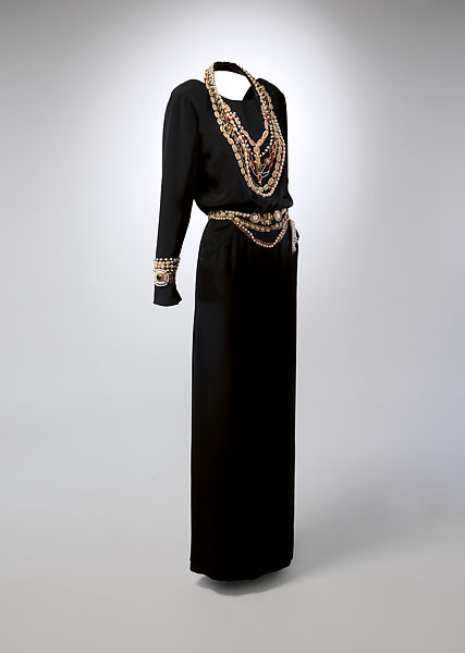 In his first collection for Chanel in 1983, Karl Lagerfeld demonstrated his respect for the tradition of its founder, Coco Chanel (1883–1971), as well as his ability to bring new life and contemporary relevance to her work. This design from that first effort cites one of her favored looks, a black dress adorned with a mass of costume jewelry. Lagerfeld’s embroidered trompe l’oeil baubles, executed by the specialist House of Lesage, are a witty take on Chanel’s embrace of fake jewelry.