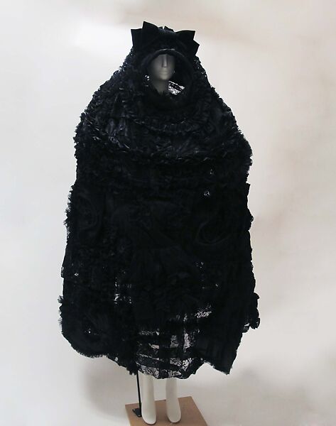 Since founding Comme des Garçons ("like some boys") in 1969, the Tokyo-based designer Rei Kawakubo has consistently defined and redefined the aesthetics of our time. Season after season, collection after collection, she upends conventional notions of beauty and disrupts accepted characteristics of the fashionable body. While Kawakubo has been described as an "intellectual" designer, she insists that her work deals with her instincts and emotions. Her collections contain deeply personal and self-reflective narratives imbued with profound spirituality. The fashions in her autumn/winter 2015 collection "Ceremony of Separation" can be interpreted as expressions of mourning dress and represent a meditation of the fragility of life and the finality of death. This dress obscures the figure in layers of black lace and net, appliqued with miniature dresses and bonnets in the style of childrenswear from the 1830s and ’40s..