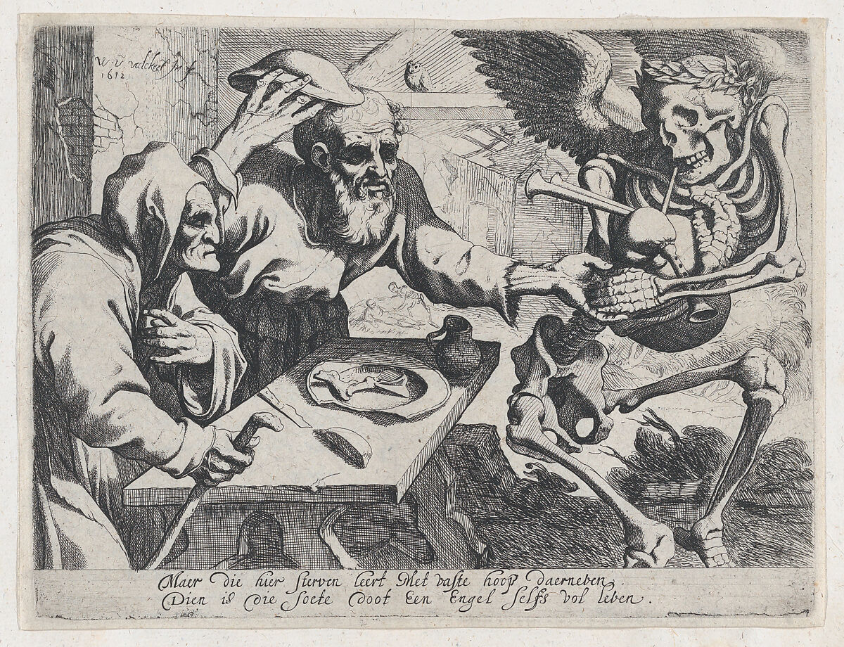 The Old Couple and Death with Bagpipes is part of a pair of prints relating to the traditional theme the Dance of Death. In the pendant to this print, a frightening Death, his skull sprouting snakes, approaches a wealthy young couple who fight him as they protect their riches. In this print a poor, elderly couple have lived a long life and willingly follow a Death, crowned with a wreath, who leads them to the tune of his bagpipe. The Dutch painter Werner van den Valckert created a number of etchings early in his career. Several of these are genre subjects that comment on the foolishness of the world.