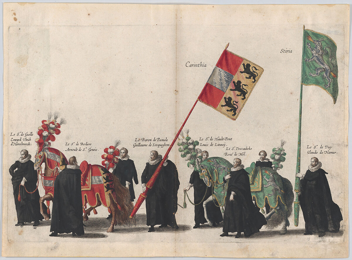 - Title: Plate 44: Men with heraldic flags and horses from Carinthia and Styria marching in the funeral procession of Archduke Albert of Austria; from 'Pompa Funebris ... Alberti Pii'