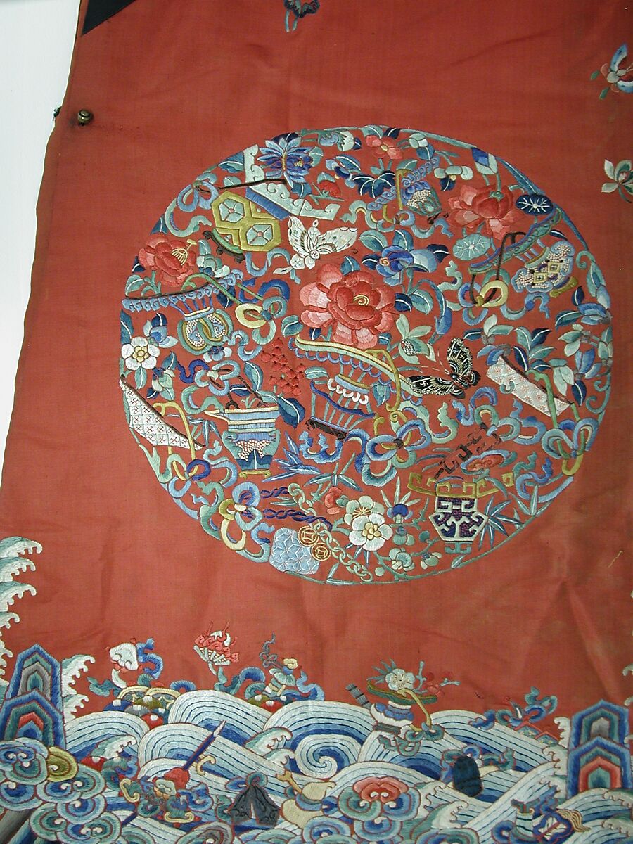 This warmly padded ceremonial robe with roundels would have been worn by a Manchu woman for celebrations of the winter months, but the embroidered flowers in decorative containers are from all the seasons, including a lotus for summer, a chrysanthemum for autumn, nandina berries for winter, and plum blossoms for spring, as well as the full-blown peony with an orchid in the center vase.