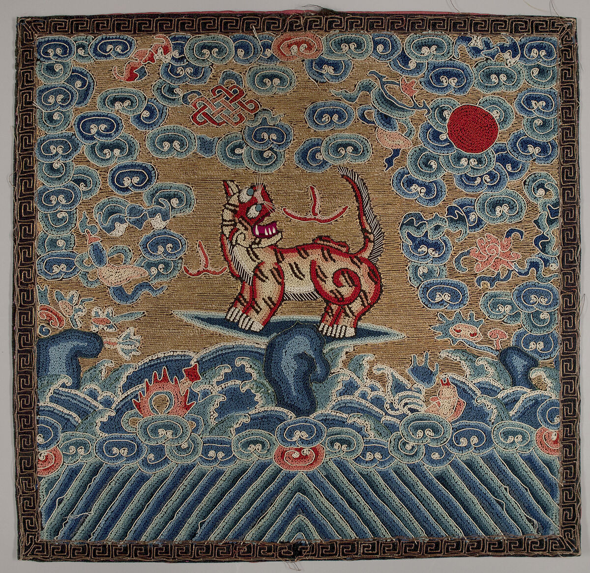 Government officials of the Ming and Qing dynasties wore square badges sewn on the front of their robes. These badges were embroidered with birds for civil officials and animals for military officers—each creature corresponding to a specific rank. A symbol of authority and bravery, the tiger adorned the badge of a senior commander (Rank 3) in the Ming and that of a regimental vice commander (Rank 4) in the Qing.