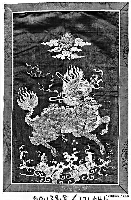 - Medium: Silk, metallic thread; on silk; bordered in silk bound with silk; lined with cotton