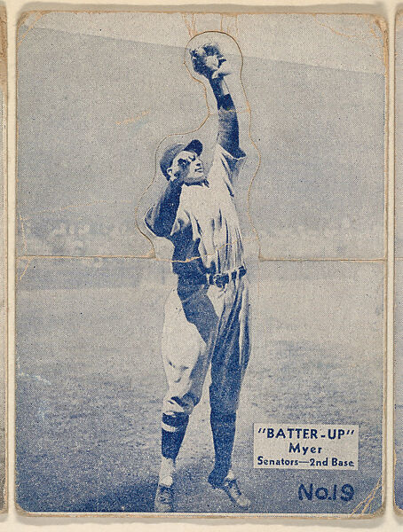 - Title: Card 19, Myer, Senators, 2nd Base (Blue), from the Batter Up series (R318) issued by the National Chicle Gum Company