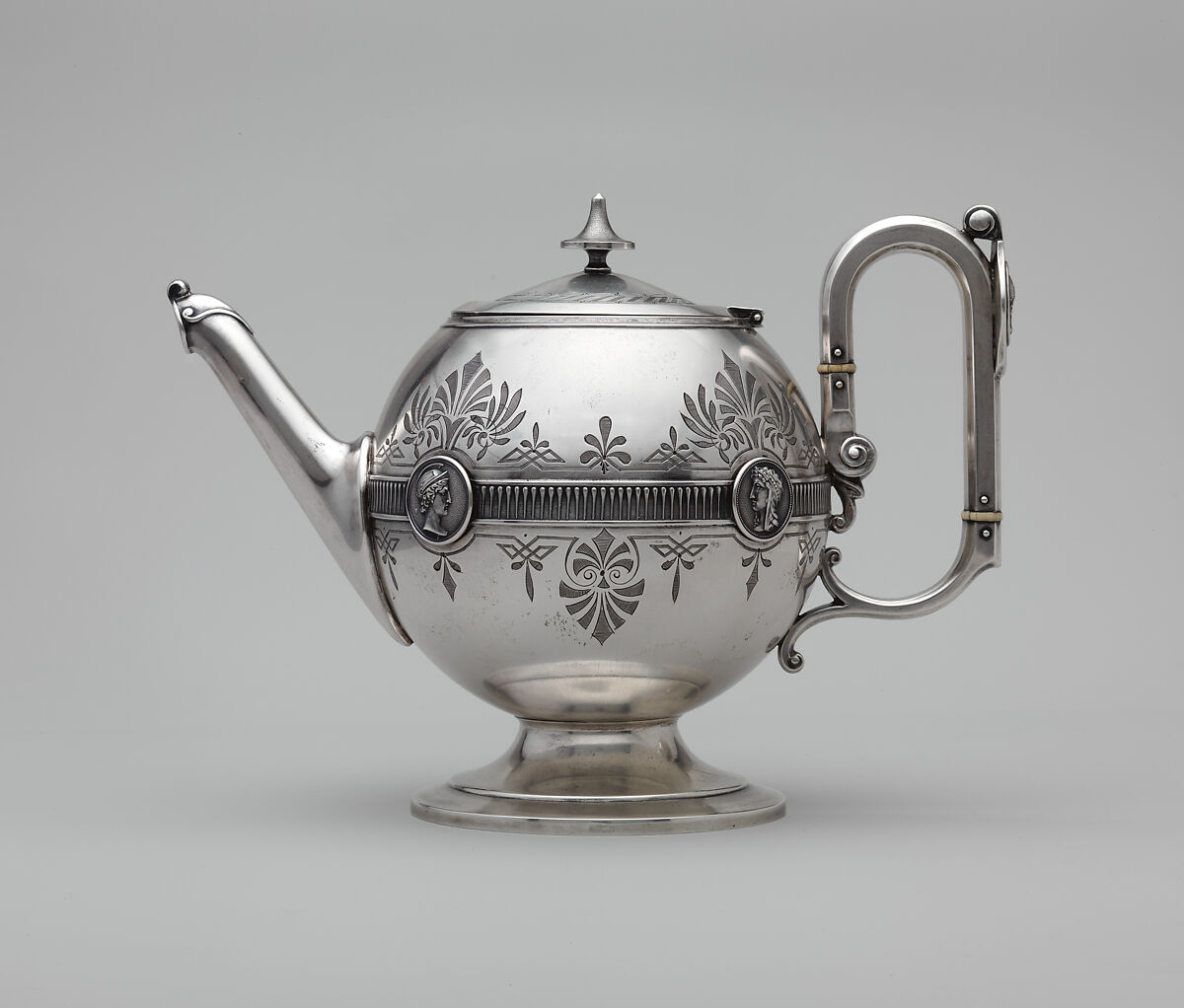 The mid-nineteenth century witnessed an efflorescence of creativity in the American silver industry, fueled by the burgeoning middle class’s increasing demand for refined luxury goods. Silversmiths devoted considerable time and creative energy to generating an endless variety of new designs and patterns. During the 1860s and 1870s silver flatware ornamented with portrait medallions inspired by antique coins and cameos enjoyed widespread popularity, with virtually every American silversmith producing their own proprietary "medallion" pattern. Gorham Manufacturing Company’s designer George Wilkinson patented a medallion flatware pattern in 1864, and the quantity and variety of surviving silver in this pattern attest to its success. Medallions from this flatware pattern ornament the tea set as well as a toast rack (.4) and goblet (.5) in the American Wing’s collection. Although the three pieces match, they are an assembled set; the teapot is engraved "Linda," and the creamer and sugar bowl are engraved "T. S. B." These objects would have been proudly displayed and used on the table as a testament to their owner’s taste and sophistication.