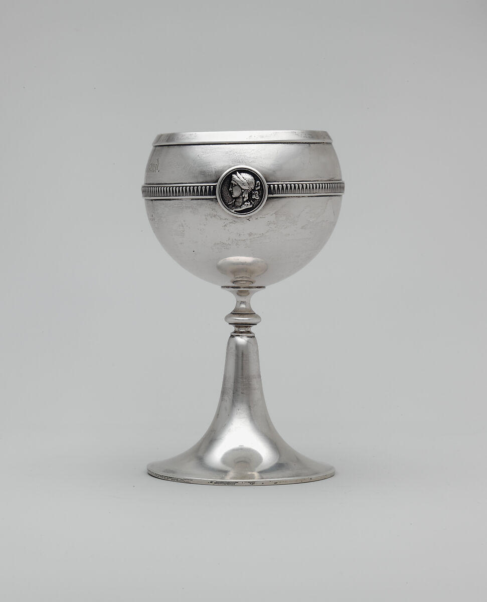 The mid-nineteenth century witnessed an efflorescence of creativity in the American silver industry, fueled by the burgeoning middle class’s increasing demand for refined luxury goods. Silversmiths devoted considerable time and creative energy to generating an endless variety of new designs and patterns. During the 1860s and 1870s silver flatware ornamented with portrait medallions inspired by antique coins and cameos enjoyed widespread popularity, with virtually every American silversmith producing their own proprietary "medallion" pattern. Gorham Manufacturing Company’s designer George Wilkinson patented a medallion flatware pattern in 1864, and the quantity and variety of surviving silver in this pattern attest to its success. Medallions from this flatware pattern ornament the goblet as well as a tea set (.1-.3) and toast rack (.4) in the American Wing’s collection. The goblet bears the marks of a Boston retailer, Bigelow Bros. & Kennard and is engraved, "Mary S. Lackland /from / Henry & Emilie Kayser / August 23rd 1865." Research has yet to be done to identify the recipient and the donors; however, they were likely Bostonians for whom silver ornamented with fashionable classical medallions offered evidence of their taste and sophistication.