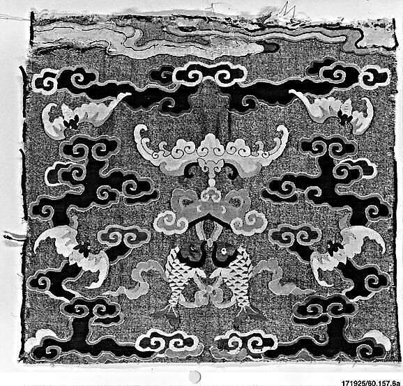 This panel probably came from a chair cover, possibly from the part that covered the seat. Word play makes the motifs auspicious: five bats (fu, a homophone for the Chinese word for happiness) surround a musical stone and a pair of fish, associated with good fortune and affluence.