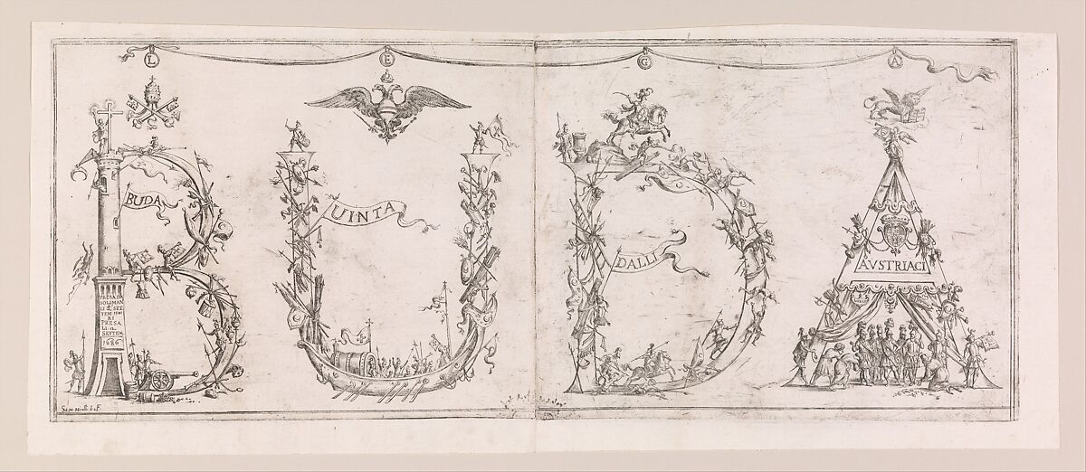 The Hungarian city of Buda was occupied by the Turks for almost 150 years before it was liberated by the combined forces of the Austrians and Hungarians in 1686. The print is on two joined sheets. The word BUDA (as in Budapest) is constructed from contorted figures and different forms. It is framed by an etched border and in the upper section is the symbol of the Imperial Eagle.