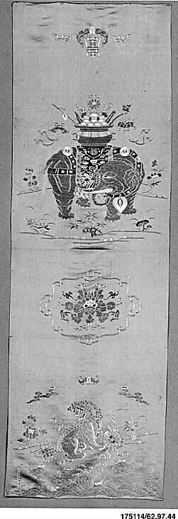 The length of this chair strip is divided into segments, with a different design for each part of the chair being covered—the front legs, seat, and back, and a short segment that hangs behind the chair. Elements of standard rebuses are present in the section with the elephant embroidery, where various treasures and auspicious objects crowd the vessel on the elephant's back. For example, the frequent pairing of a musical stone and a halberd occurs on one side of the vessel, representing a celebratory occasion. On the other side of the vessel, peaches, symbolizing longevity, dangle from a branchlike decorative accessory (ruyi), which stands for wish fulfillment. The elephant is a rebus for a sign. Thus, the composite motif is read as "signs of celebration and longevity."