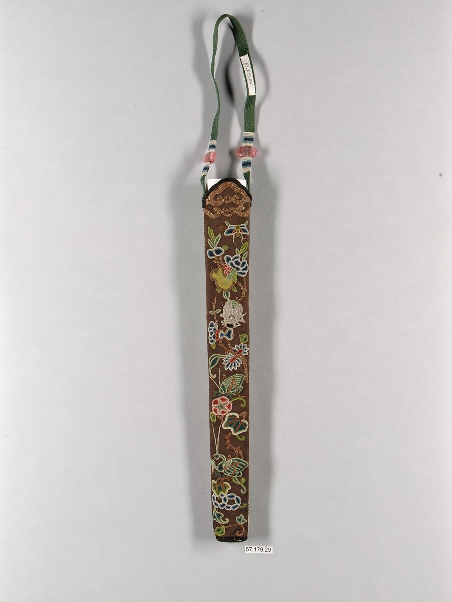 Shown here is an embroidered fan case—an accessory worn at the waist for holding folding fans when they were not in use. It features an unusual technique—raised-work embroidery, which produces a three-dimensional effect (note the insect motifs).