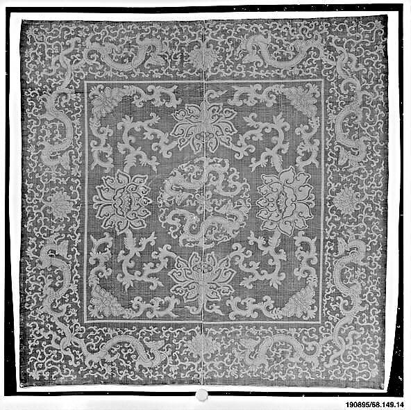 This cover for a seating platform (kang) or a large chair seat has a pattern of floral and dragon scrolls that was carefully designed to appear right side up when viewed from any of its four sides. The graphic quality of the design is achieved through differences in the reflectivity of the two surfaces on the face of the velvet. The background is rendered in cut pile, which tends to absorb light, while the pattern consists of uncut loops, which are more reflective. Fairly common in Chinese velvets, this use of cut and uncut areas to delineate the pattern allowed considerable freedom of design but demanded great skill.