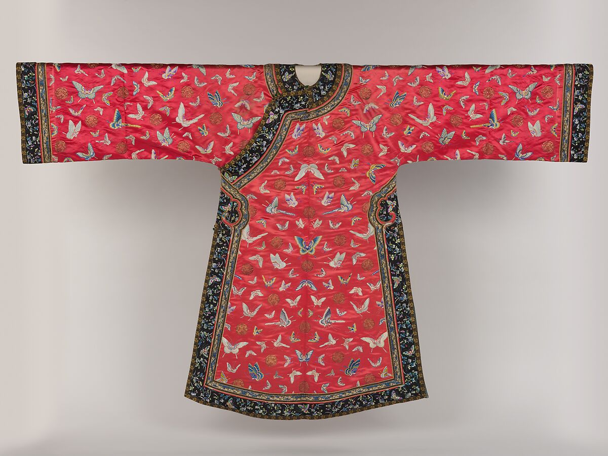 On this robe, scores of delightful butterflies flutter among longevity medallions. Since the word for “butterfly” in Chinese (die) is a homonym for “octogenarian,” the butterfly is a symbol of longevity. It is also usually an auspicious image associated with joy and weddings, and this robe might have been worn for such an occasion.