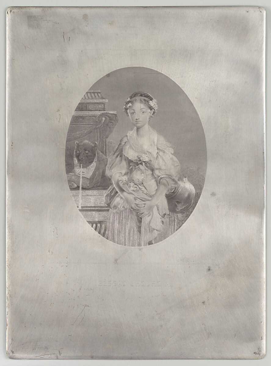 A steel-faced copper plate with an oval engraving after Jean-Baptiste Greuze’s The Broken Pitcher, 1771 (Musée du Louvre, Paris).