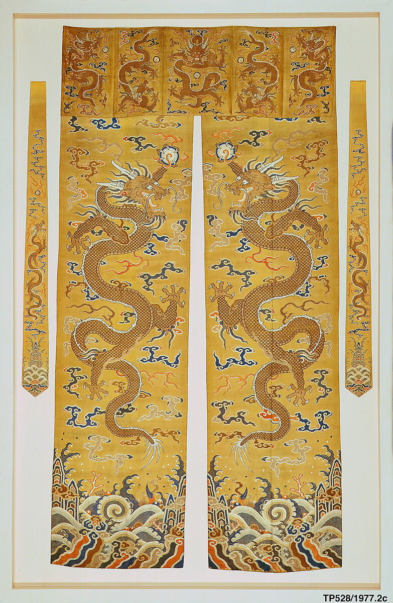 The striking five-clawed dragons and the impeccable quality of this valance and side panels set suggest that it decorated a doorway in an imperial residence. The figure of the dragon has a number of associations and incarnations—all positive—in Chinese mythology. Here, the dragons primarily signify the emperor as the Son of Heaven and the intercessor between heaven and earth on behalf of the people.