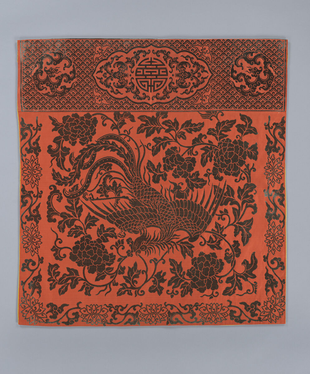In a traditional Chinese reception hall, chairs for the hosts are set in pairs on either side of a central table and are covered with textiles that are not adhered directly onto the furniture. Made with velvet, the textiles provide not only comfort but also a pleasing aesthetic due to their shine and elegance. Here, the motif of phoenixes among peonies symbolizes noble women, making these pieces suitable for use in a lady’s quarters.