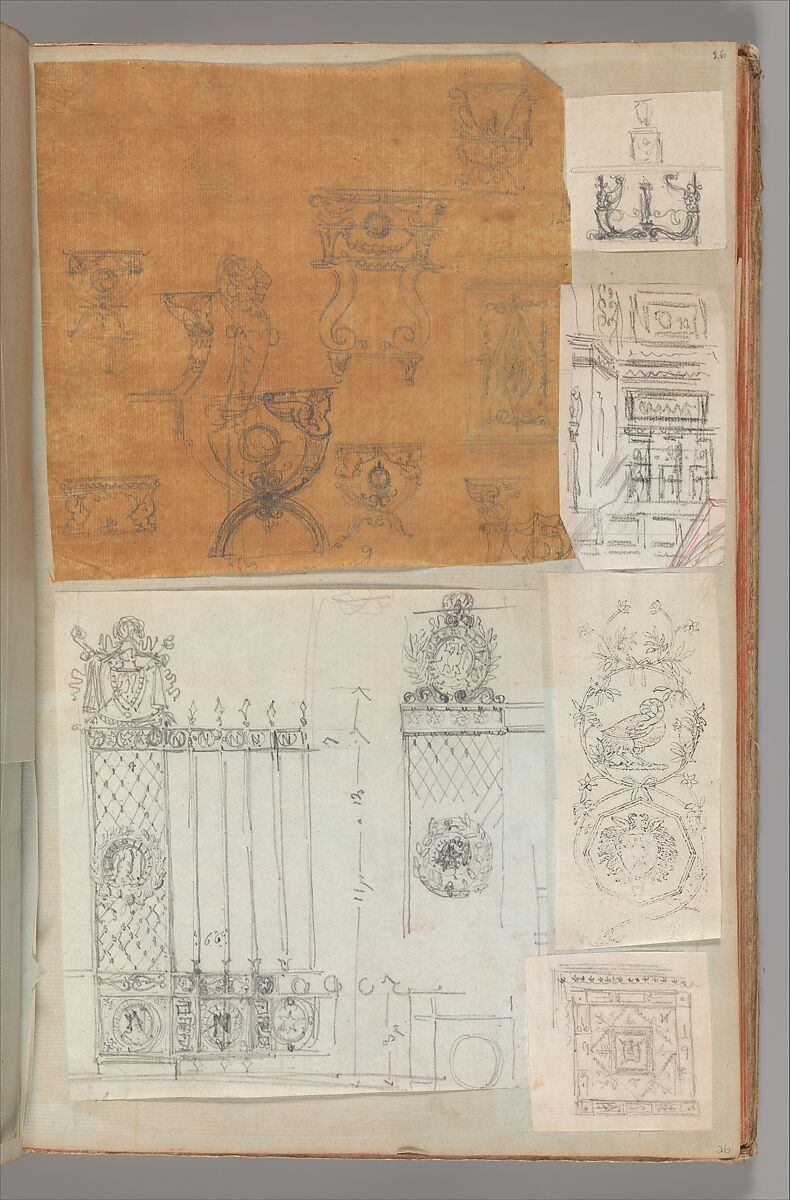 - Title: Page from a Scrapbook containing Drawings and Several Prints of Architecture, Interiors, Furniture and Other Objects