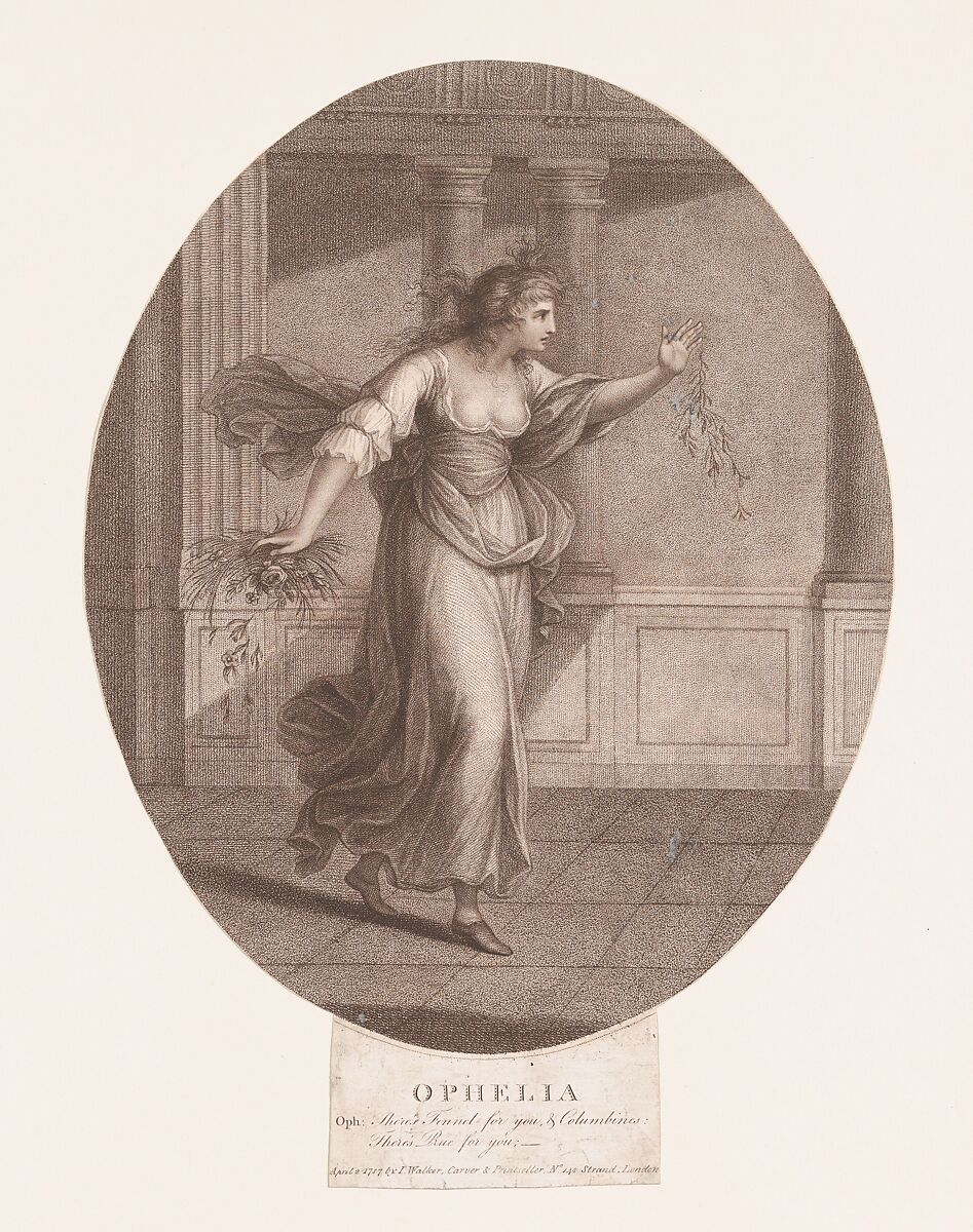 Ophelia appears here in act 4 of Shakespeare's play, her mind unhinged by her father's murder. Singing and crowned with weeds, she offers herbs and flowers to her brother, the queen and king. Soon after this scene, she will fall into a brook while picking flowers and drown. Ryland's print is based on a drawing by Cipriani.
