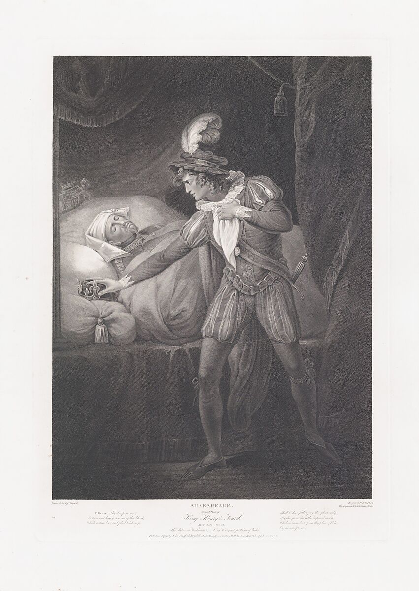 This image centers on a dramatic moment in King Henry IV, Part 2, where Prince Hal approaches the bedside of his dying father and tries on the crown. The work was conceived for John Boydell's Shakespeare Gallery, launched in 1786 as a publishing-cum-exhibition scheme that included a new illustrated edition of the plays, sets of large and small engravings, and a gallery on London's Pall Mall. The latter opened in 1789 with thirty-four paintings and contained about one hundred and seventy works the time Boydell went bankrupt and auctioned the contents in 1805–his print sales plummeted when Napoleon blocaded European ports. This impression belongs to an American reissue of 1852 spearheaded by Shearjashub Spooner, a New York dental surgeon and art scholar who acquired Boydell's heavily worn plates and had them reworked. Printed on thick cream colored paper, the New York edition added small numbers in the lower left margin, this being number 64.