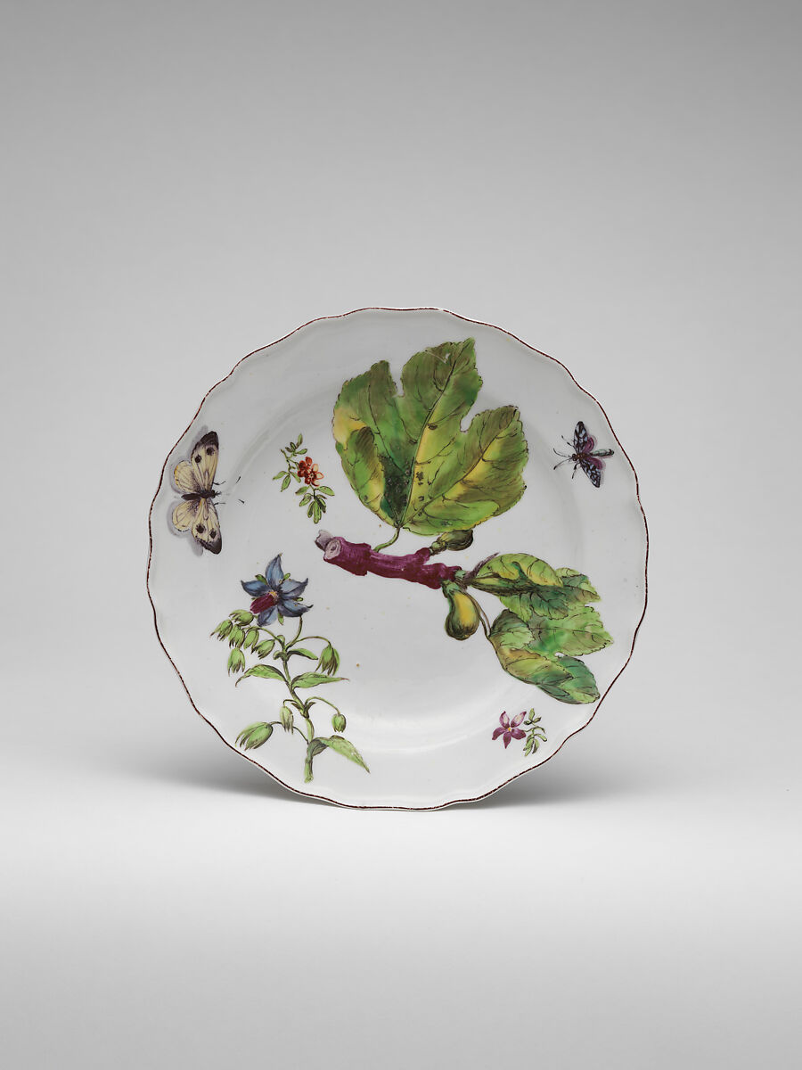 These botanical plates (2016.217–.226) were produced by the Chelsea factory around 1755 and are often referred to as Chelsea "Hans Sloane" wares, in reference to the royal physician, traveler, and natural historian who helped transform the Chelsea Physic Garden into a center of botanical knowledge during the British Enlightenment. Several subjects depicted on these plates were taken from botanical illustrations published by Philip Miller, curator of Chelsea Physic Garden. Although flowers and fruits could typically be found on earlier porcelain wares from Meissen, the lively naturalism of the Chelsea botanical plates reflects a broadening public interest in the natural world, and evidence the forms of global commerce that brought exotic species from the Caribbean, the Americas, and Asia to England.