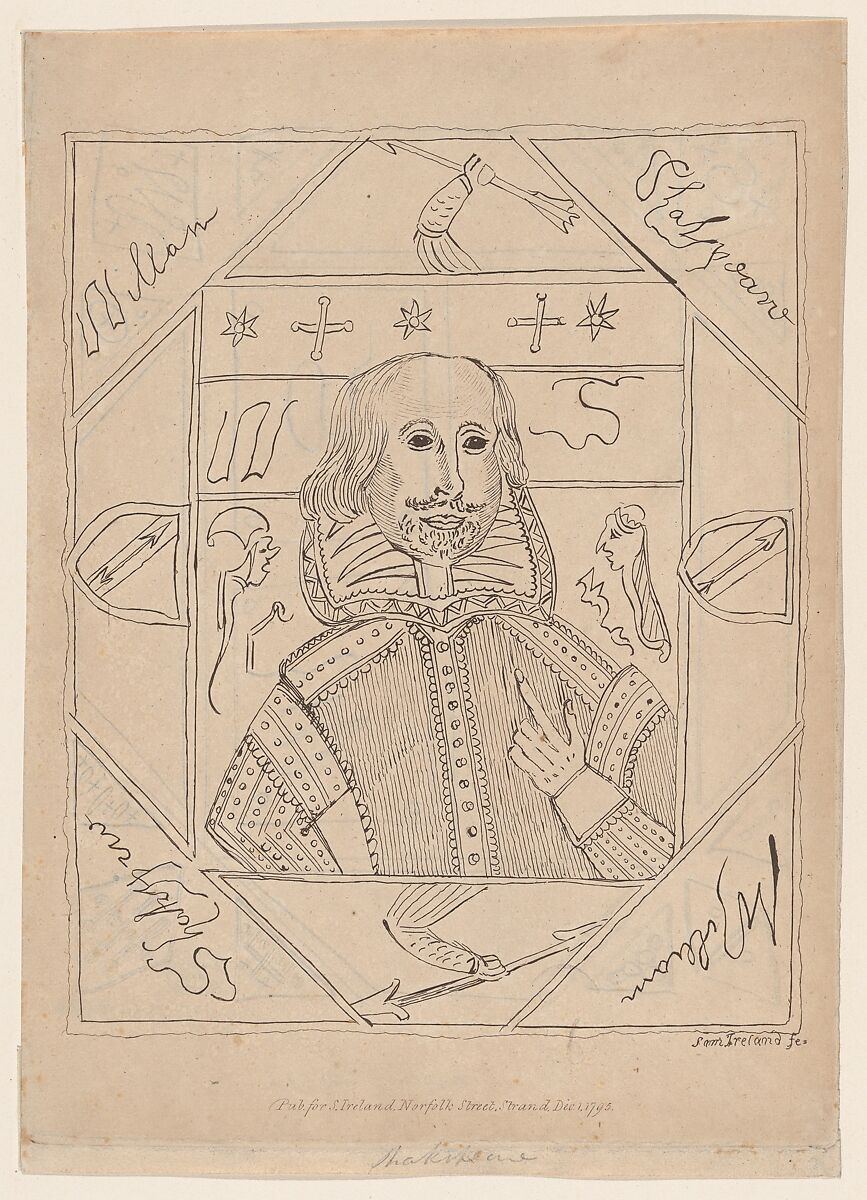 This etching reproduces a supposed self-portrait sketch by Shakespeare actually created by William Henry Ireland during a famous forgery scandal of the 1790s. Ireland faked a cache of letters, documents, and drafts of plays calculated to shed light on the Bard's life and beliefs, and claimed to have found them in an old trunk. Taken in by his son, Samuel Ireland published "Miscellaneous Papers and Legal Instruments Printed Under the Hand and Seal of William Shakespeare" (1796), using the present image as an illustration. It was said to have been inserted in a letter and there described as a "whysycalle conceyte." The Shakespeare authority Edmond Malone soon debunked Ireland's claims and described the portrait as "most truly whimsical, being a miserable drawing of our poet done by himself with a pen, from Martin Droeshout's print of him engraved seven years after his death" (see 17.3.756-1108 for the latter).
