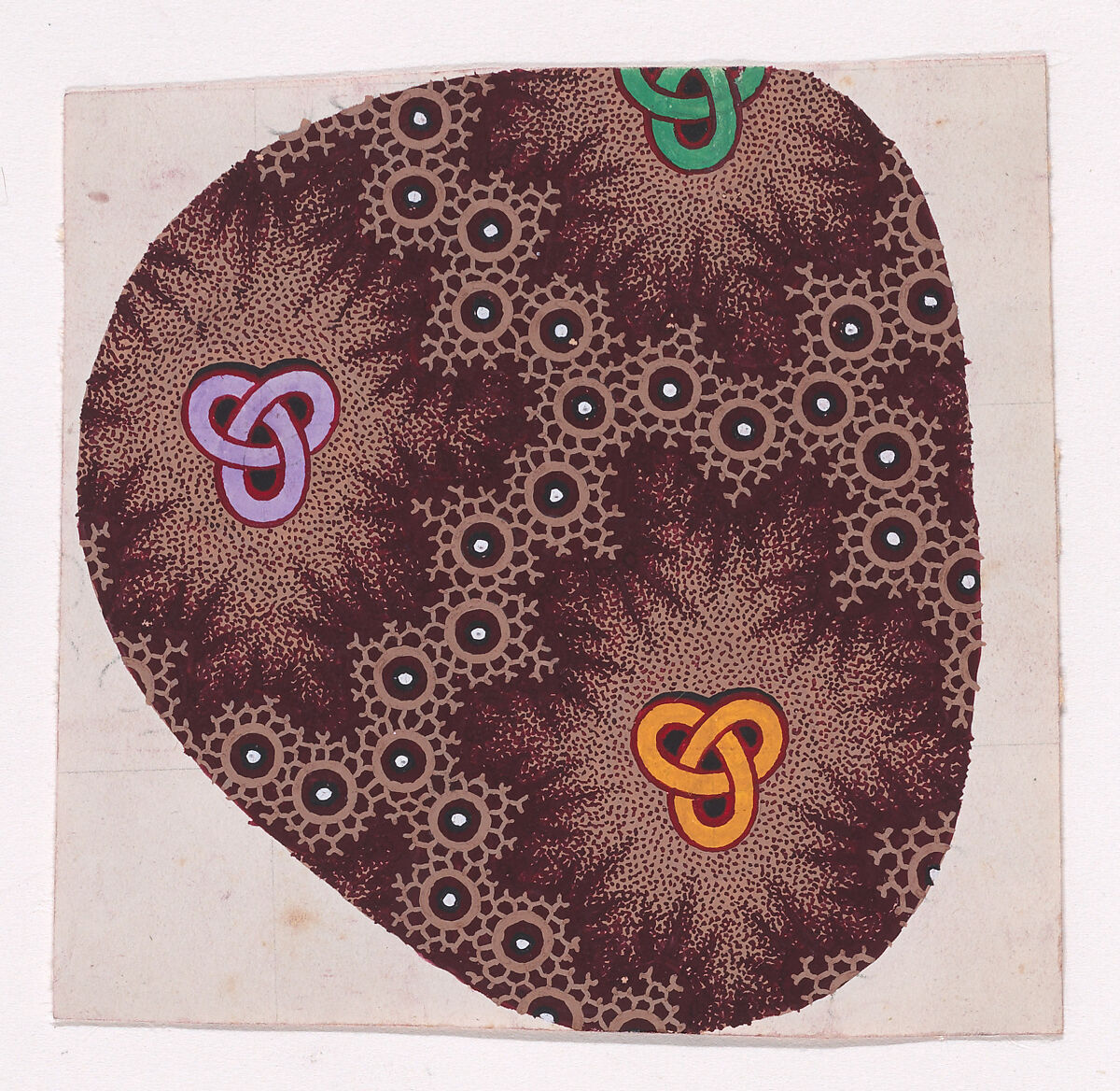 Rectangular sheet of paper with a textile design from a group, dated 1840, made in Mulhouse, Alsace, which was an important nineteenth-century center for textile production in the Haut-Rhin region of France. The design is made up of alternating rows of trefoil knots framed by an interlacing honeycomb pattern of light tan color over a dark reddish-brown base decorated with pearls framed by circles, and with offsetting thorns rendered with stipples of dark reddish-brown color, over a background of light tan color with stipples of dark reddish-brown color. The knots are colored alternatingly with purple, orange, and green, and are outlined with red. The pearls are of white color.
