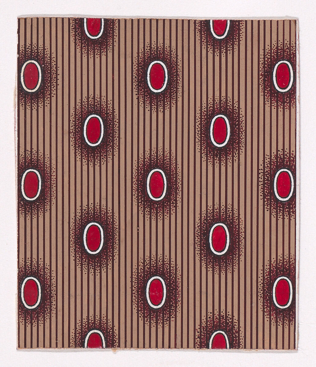 Rectangular sheet of paper with a textile design from a group, dated 1840, made in Mulhouse, Alsace which was an important nineteenth-century center for textile production in the Haut-Rhin region of France. The design is made of dark red ellipses bordered in white and surrounded by a stippled shade of dark reddish-brown color over a striped background of dark reddish-brown lines over a light tan base.