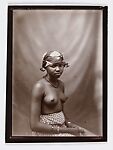 Untrimmed black and white photograph (printed by Jerry L. Thompson in 1975, NY.) A lone female figure is seated in an interior studio setting in front of a fabric backdrop. She is barechested, and wears a checkerboard patterned skirt around her waist and a geometric-patterned head wrap. The portrait focuses on her waist and above and her body is angled to the photographer with her right shoulder closer to the viewer. She wears a simple beaded necklace, small earrings, and a few bracelets. She holds an unidentifiable object in her right hand.