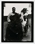 Untrimmed black and white photograph (printed by Jerry L. Thompson in 1975, NY.) The subject is a seated group of man, woman, and young child. The man wears a common buttoned chemise overlaid with a dark, horizontally-striped prestige cloth. The woman sports a head wrap, a simple blouse and a patterned skirt while the child wears a casual white cotton sleeveless shirt. The group sits in chairs in an outdoor setting, evidenced by the exterior of a building in the background. The image is tightly cropped around the group and is taken from an angle slightly above their heads.