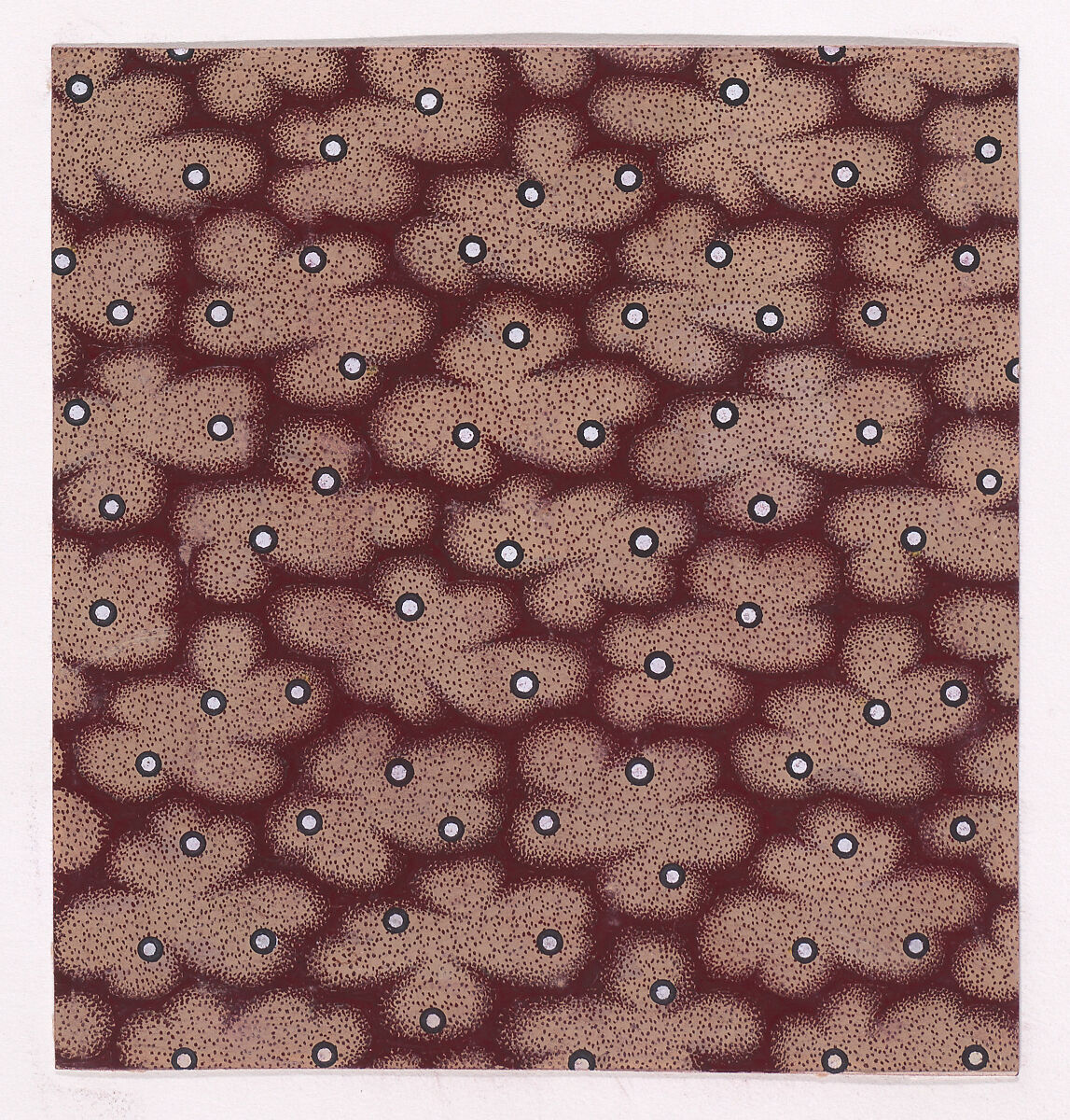 Rectangular sheet of paper with a textile design from a group, dated 1840, made in Mulhouse, Alsace, which was an important nineteenth-century center for textile production in the Haut-Rhin region of France. The design is made up of a dark reddish-brown base over which cloud-like figures in light tan with dark reddish-brown stipples stand out. The clouds are adorned with pearls of white color and a black outline.