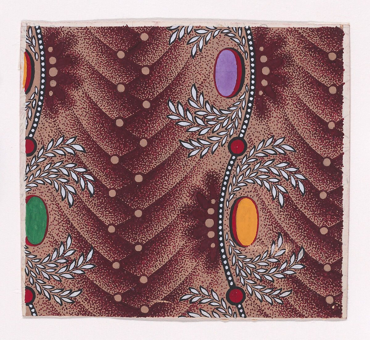 Rectangular sheet of paper with a textile design from a group, dated 1840, made in Mulhouse, Alsace, which was an important nineteenth-century center for textile production in the Haut-Rhin region of France. The design is made up of a light tan base and alternating vertical stripes of zig-zagging pearls of light tan color, over overlapping scales rendered with dark reddish-brown stipples, and ovals framed by crowns of laurel leaves and a group of five pearls of light tan color over six petals of dark reddish-brown color placed alternately along an undulating line of black color adorned with pearls and circles. The circles are of red color and outlined in black and the pearls are of white color. The ovals are purple, orange, and green, all outlined in red color and with shade in black, and the laurel leaves are of white color with black outlines.
