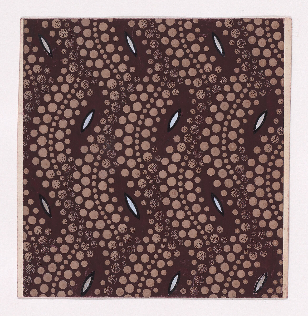 Rectangular sheet of paper with a textile design from a group, dated 1840, made in Mulhouse, Alsace, which was an important nineteenth-century center for textile production in the Haut-Rhin region of France. The design is made up of a brown base over which overlapping groups of five undulating vertical stripes of pearls of light tan color run through. In the spaces between the undulating stripes, shuttle-shaped motifs of white color and black outline stand out.