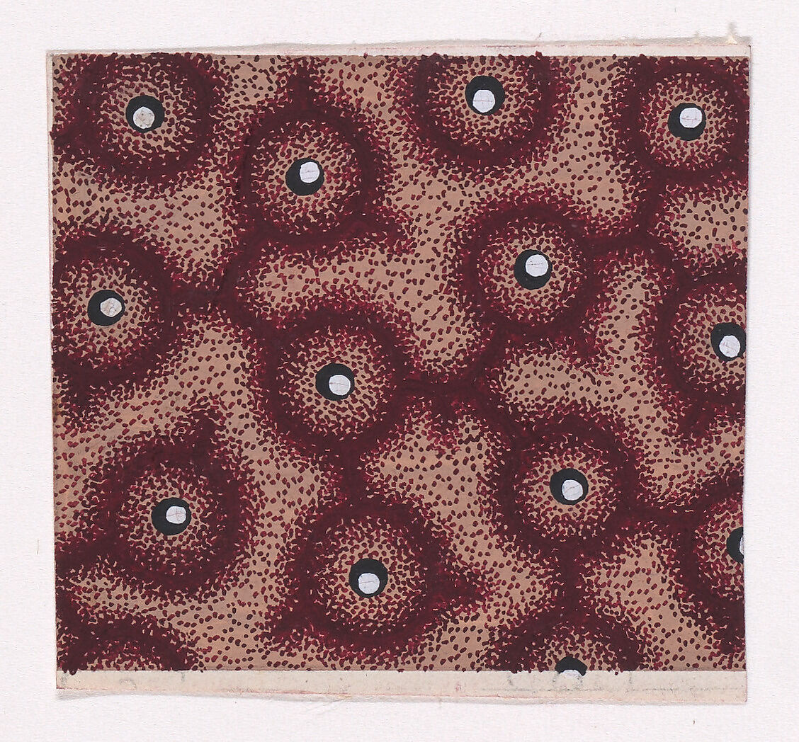 Rectangular sheet of paper with a textile design from a group, dated 1840, made in Mulhouse, Alsace, which was an important nineteenth-century center for textile production in the Haut-Rhin region of France. The design is made up of a network of circles rendered with stipples of dark reddish-brown over a light tan base. In the center of each circle there is a pearl of white color, outlined in black.