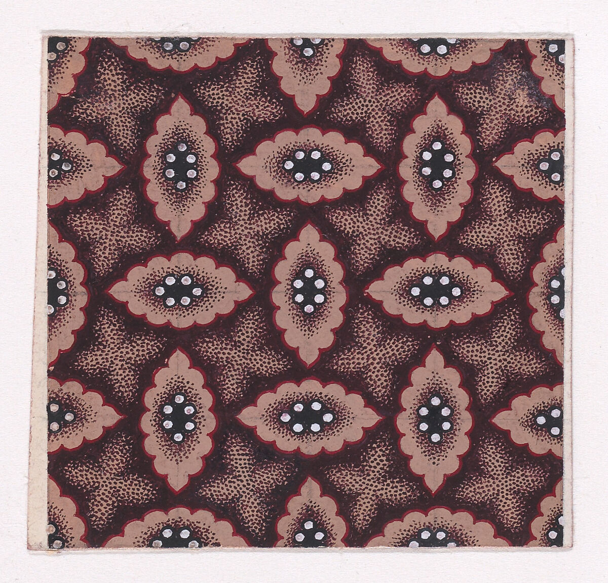 Rectangular sheet of paper with a textile design from a group, dated 1840, made in Mulhouse, Alsace, which was an important nineteenth-century center for textile production in the Haut-Rhin region of France. The design is made up of alternating strips of groups of three pearls framed by alternating vertical undulating garlands stippled with dark reddish-brown color over a light tan base. The pearls are colored with white.
