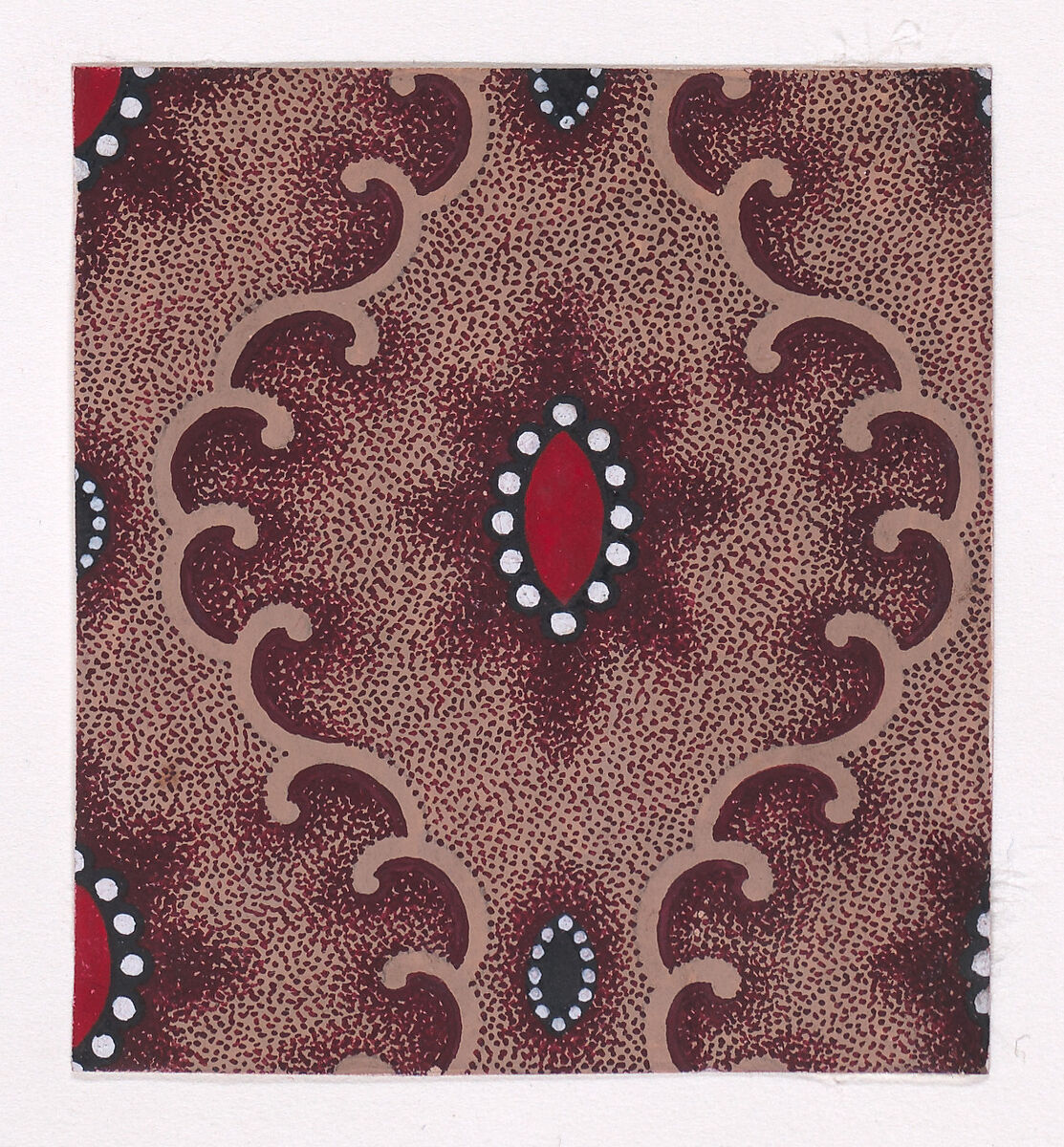 Rectangular sheet of paper with a textile design from a group, dated 1840, made in Mulhouse, Alsace, which was an important nineteenth-century center for textile production in the Haut-Rhin region of France. The design is made up of vertical rows of alternating vertical lens-shapes of two different sizes bordered by pearls, separated by vertical scrolls of ribbons of light tan color with shades formed by stipples of dark reddish-brown color, over a light tan background with stipples of dark reddish-brown color. The larger lenses are of dark red color and are positioned over a star-like shape rendered with dark reddish-brown stipples; the smaller lenses are of black color with an off-setting shade of dark reddish-brown stipples of the same lens shape. The pearls are of white color with black outlines.
