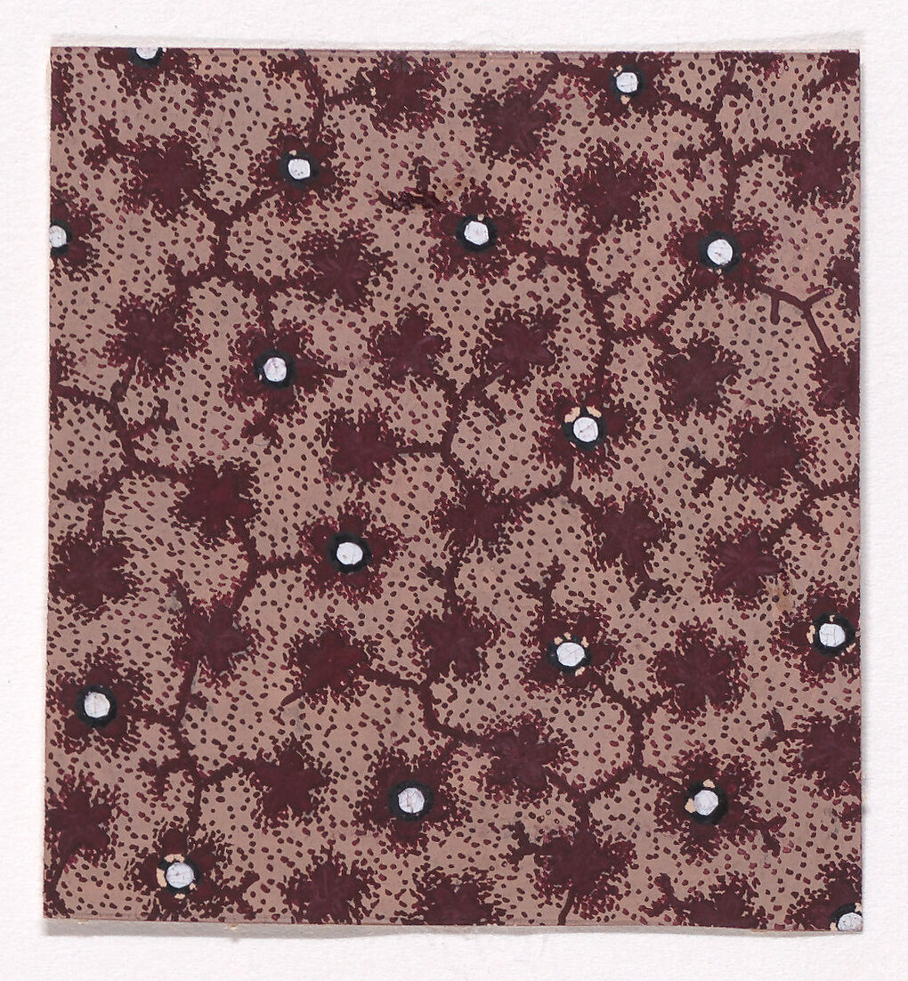 Rectangular sheet of paper with a textile design from a group, dated 1840, made in Mulhouse, Alsace, which was an important nineteenth-century center for textile production in the Haut-Rhin region of France. The design consists of a network of branches with stylized leaves and flowers rendered with stipples of dark reddish-brown color over a light tan background with stipples of dark reddish-brown color. Pearls of white color with black outlines form the pistils of some of the flowers.
