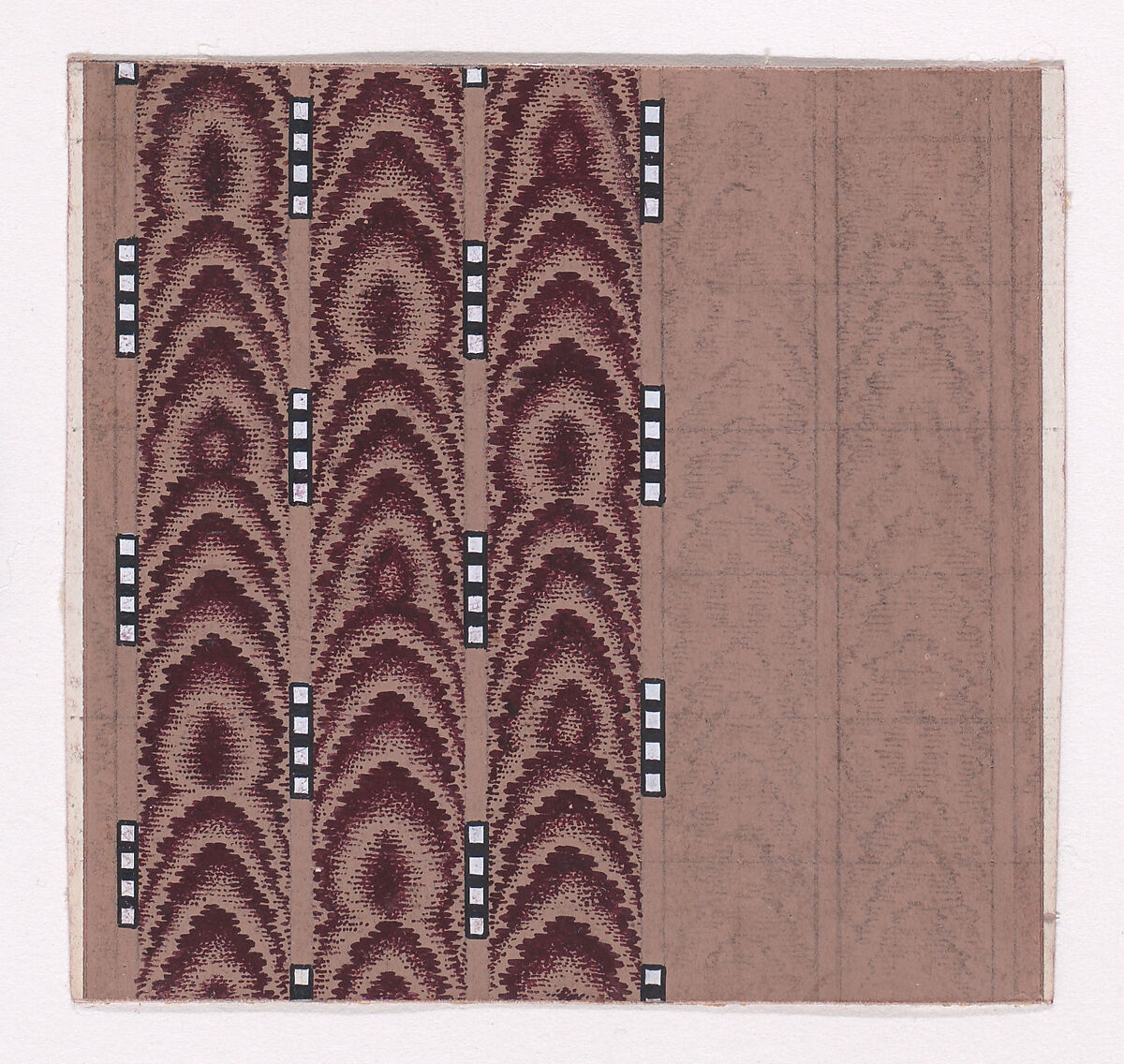Rectangular sheet of paper with a textile design from a group, dated 1840, made in Mulhouse, Alsace, which was an important nineteenth-century center for textile production in the Haut-Rhin region of France. The design consists of vertical stripes of overlapping abstract scales of dark reddish-brown color simulating a tie-dye textile, over a light tan base. The stripes are framed by alternating vertical strings of four squares of white color outlined in black. Three repetitions of the stripes of scales are rendered, the other two are incomplete, showing only the pencil traces of the outline of the pattern.