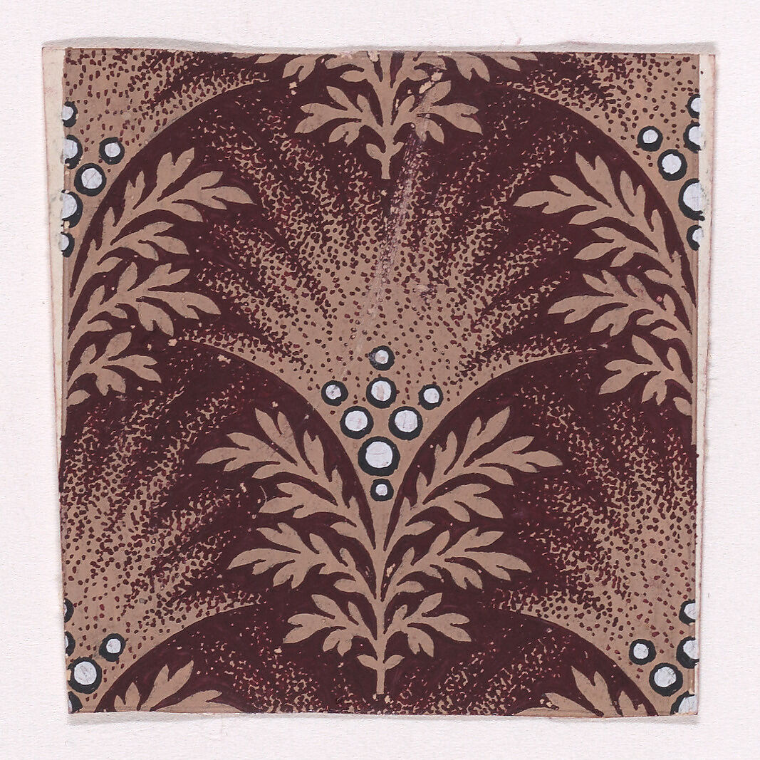 Rectangular sheet of paper with a textile design from a group, dated 1840, made in Mulhouse, Alsace, which was an important nineteenth-century center for textile production in the Haut-Rhin region of France. The design consists of alternating palmettes rendered with stipples of dark reddish-brown color over a tan base, decorated with eight pearls of white color, and flanked by a bundle of six branches with leaves of light tan color, all over a dark reddish-brown base. Only one full motif can be seen in the sheet, with only fragments of the repeats seen in the continuation of the pattern around this central palmette.