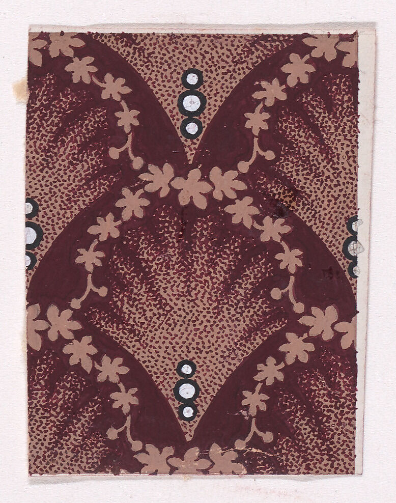 Rectangular sheet of paper with a textile design from a group, dated 1840, made in Mulhouse, Alsace, which was an important nineteenth-century center for textile production in the Haut-Rhin region of France. The design is made of alternating palmettes of light tan color with stipples of dark reddish-brown color decorated with three pearls of white color, framed by garlands of stylised flowers and flower-buds of light tan color, over a dark reddish-brown base.