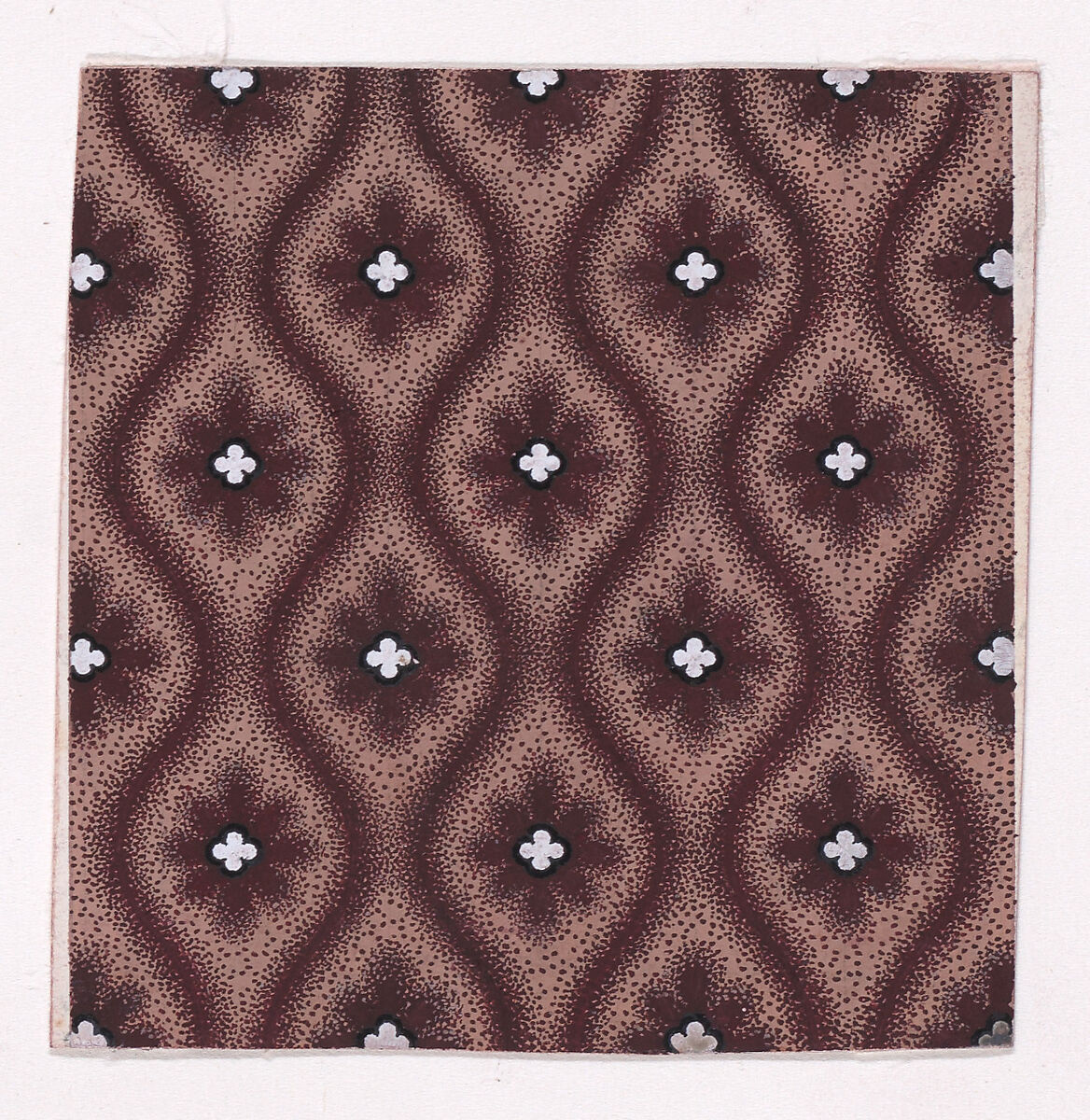 Rectangular sheet of paper with a textile design from a group, dated 1840, made in Mulhouse, Alsace which was an important nineteenth-century center for textile production in the Haut-Rhin region of France. The design is made up of alternating vertical rows of rosettes made with eight petals of dark reddish-brown color with quatrefoil shapes of white color in the center, framed by undulating vertical garlands rendered with stipples of dark reddish-brown color over a light tan ground.