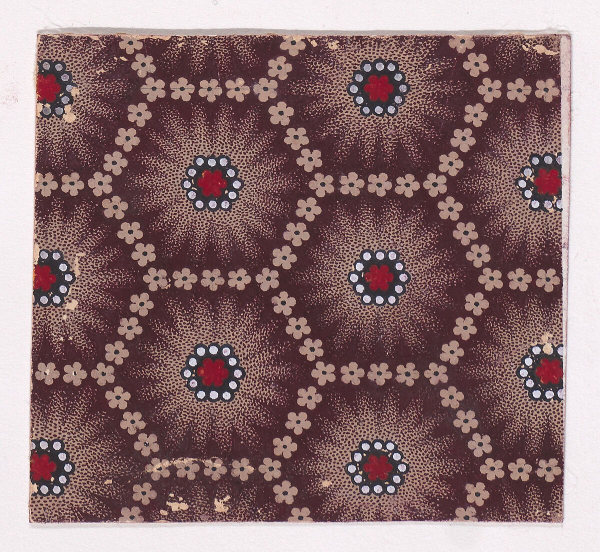 Rectangular sheet of paper with a textile design from a group, dated 1840, made in Mulhouse, Alsace which was an important nineteenth-century center for textile production in the Haut-Rhin region of France. The pattern is made up of a honeycomb pattern formed with rosettes of light tan color with offsetting thorns rendered with stipples of dark reddish-brown color over a light tan base. The center of the hexagons are decorated with rosettes of six petals framed with pearls that form alternating vertical rows. The rosettes are of red color with an outline of black color. The pearls framing the rosettes are of white color and align to form hexagons around the rosettes.