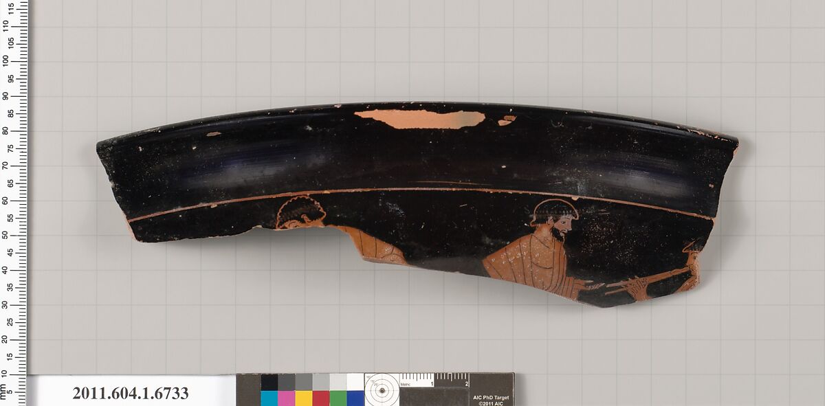 - Title: Terracotta rim fragment of a kylix (drinking cup)