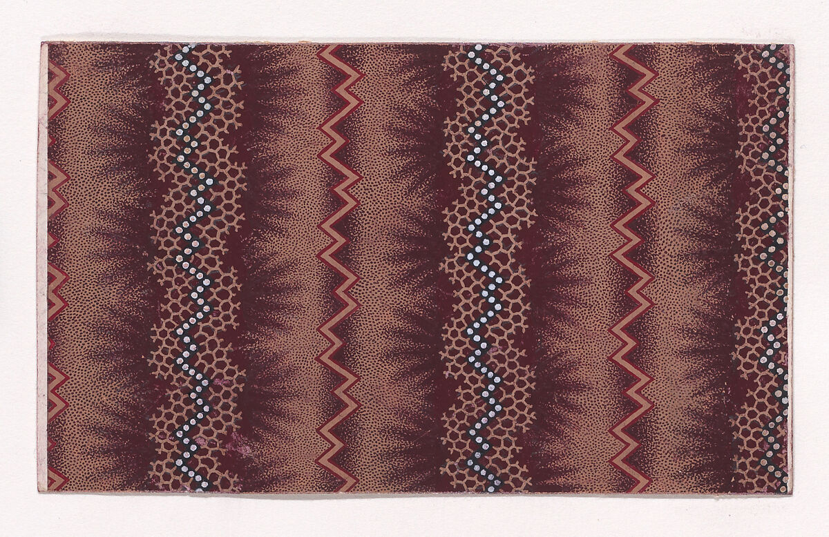 Rectangular sheet of paper with a textile design from a group, dated 1840, made in Mulhouse, Alsace which was an important nineteenth-century center for textile production in the Haut-Rhin region of France. The design is made up of alternating vertical strips: one is a vertical zig-zagging line of light tan color and dark red outlines, the other a zig-zagging strip of pearls over a honeycomb pattern of light tan color with offsetting thorns of dark reddish-brown color, over a light tan base with stipples of dark reddish-brown color. The pearls are colored with white.