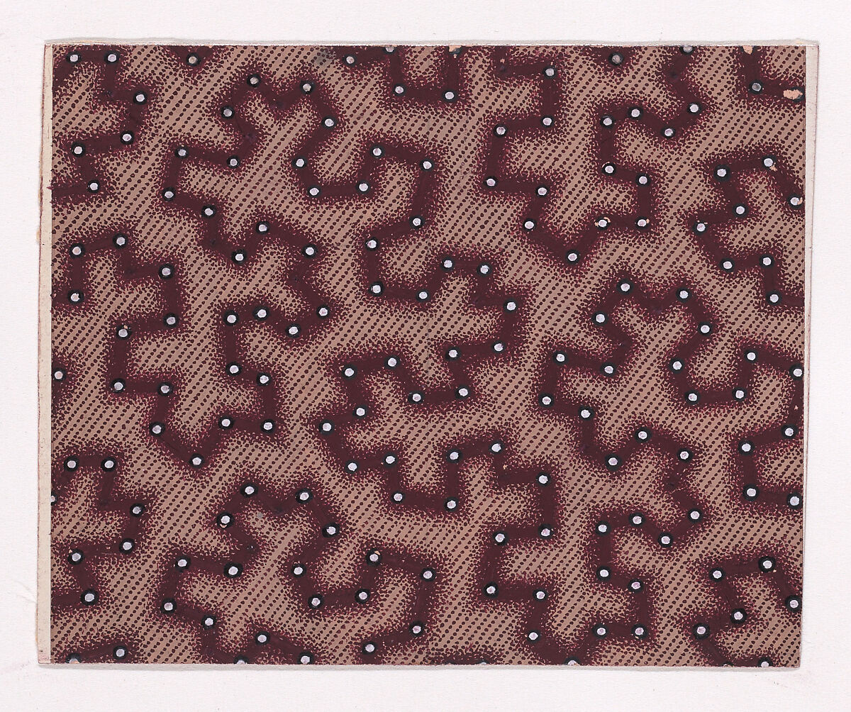 Rectangular sheet of paper with a textile design from a group, dated 1840, made in Mulhouse, Alsace, which was an important nineteenth-century center for textile production in the Haut-Rhin region of France. The design is made up of a vermicular pattern rendered with stipples of dark reddish-brown color decorated with pearls of white color over a background with diagonal stripes stippled with dark reddish-brown color over a light tan base.