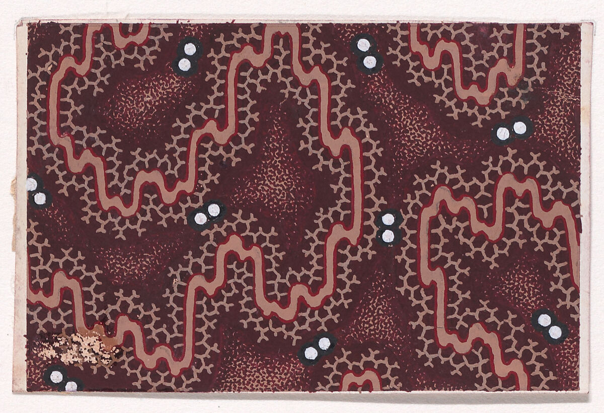 Rectangular sheet of paper with a textile design from a group, dated 1840, made in Mulhouse, Alsace, which was an important nineteenth-century center for textile production in the Haut-Rhin region of France. The design is made up of an undulating ribbon of light reddish-tan color framed by red outlines and an offsetting abstract honeycomb pattern and alternating rows of pairs of pearls and alternating rows of pairs of pearls over a light tan background with stipples of dark reddish-brown color. The pearls are of white color.