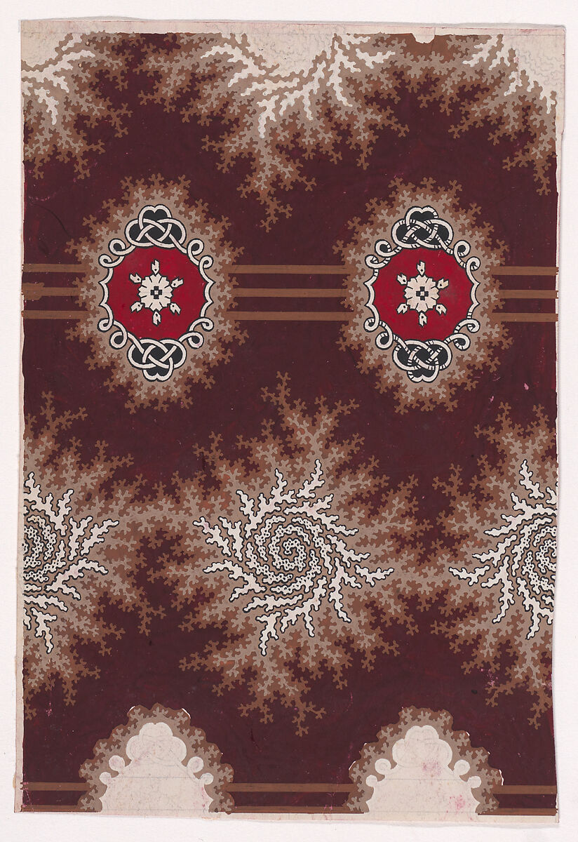 Rectangular sheet of paper with a textile design from a group, dated 1840, made in Mulhouse, Alsace, which was an important nineteenth-century center for textile production in the Haut-Rhin region of France. The design is made up of alternating horizontal garlands of branches of light tan color with tan offsets with abstract swirls of white color with black outlines and stipples and rosettes of white color flanked by six stylized leaves and framed by an interlaced ornamental motif of white color with branch offsets of tan color, joined by three parallel stripes of tan color. Two strips are fully rendered, the repetitions left unfinished.