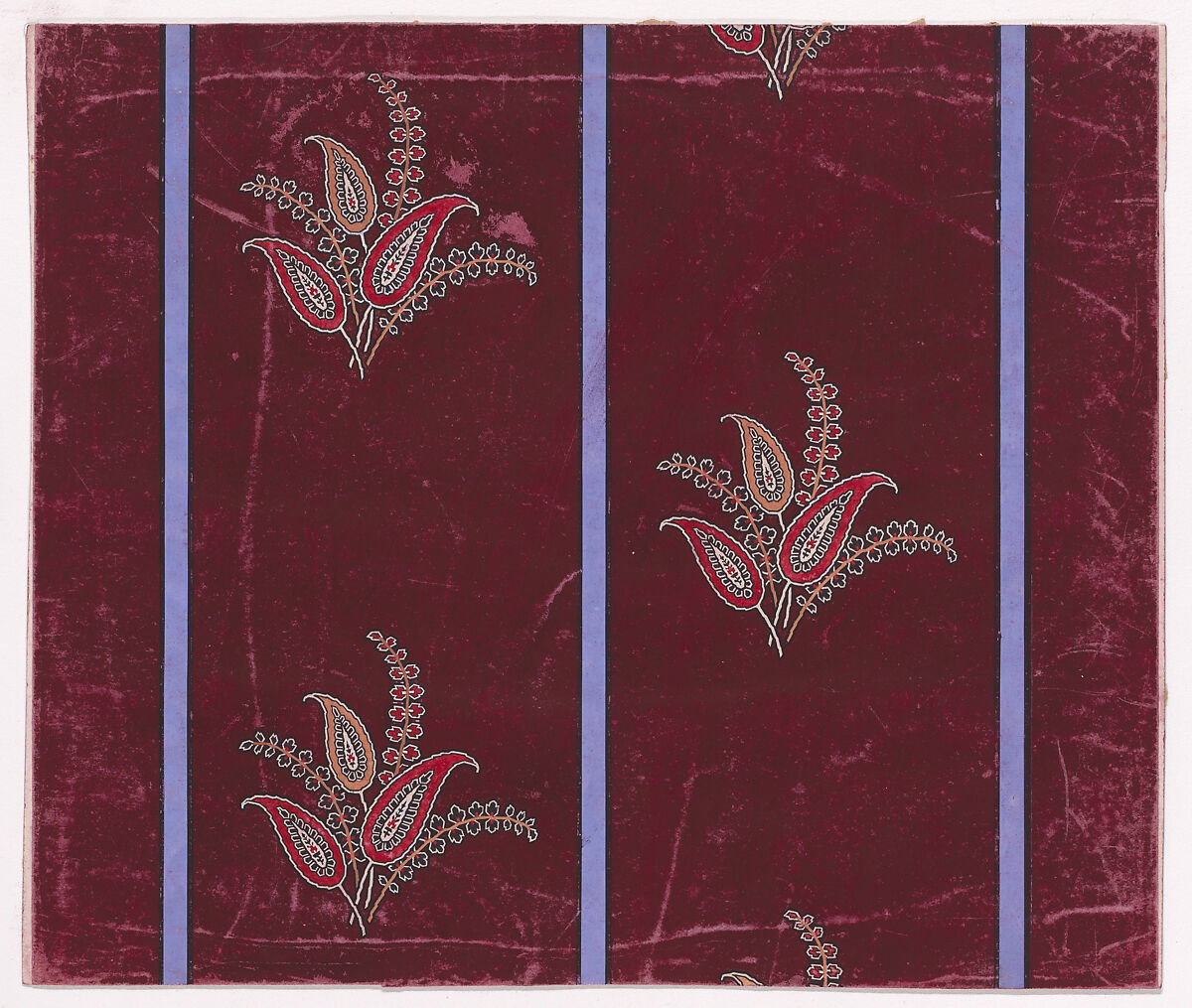Rectangular sheet of paper with a textile design from a group, dated 1840, made in Mulhouse, Alsace, which was an important nineteenth-century center for textile production in the Haut-Rhin region of France. The design is made up of alternating vertical rows of bunches of three large paisley-inspired stylized leaves and three branches with pairs of small stylized leaves separated by vertical stripes of purple color over a ground of burgundy color. The paisley-inspired leaves have decorations of cream and black colored; two of them are of red color and one is of tan color. Two of the branches with pairs of stylized leaves are of black color, the other is of red color.