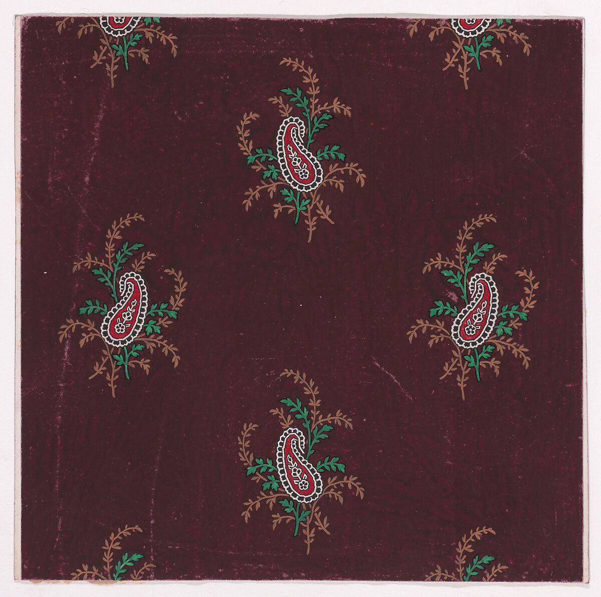 Rectangular sheet of paper with a textile design from a group, dated 1840, made in Mulhouse, Alsace, which was an important nineteenth-century center for textile production in the Haut-Rhin region of France. The design is made up of alternating rows of bunches of scrolling branches with stylized leaves and a paisley motif over a dark burgundy ground. The stylized leaves are colored with reddish-tan and green. The paisley motifs are colored with red and black, and have a small stylized flower flanked by a stem with leaves of black color and outlined with white.