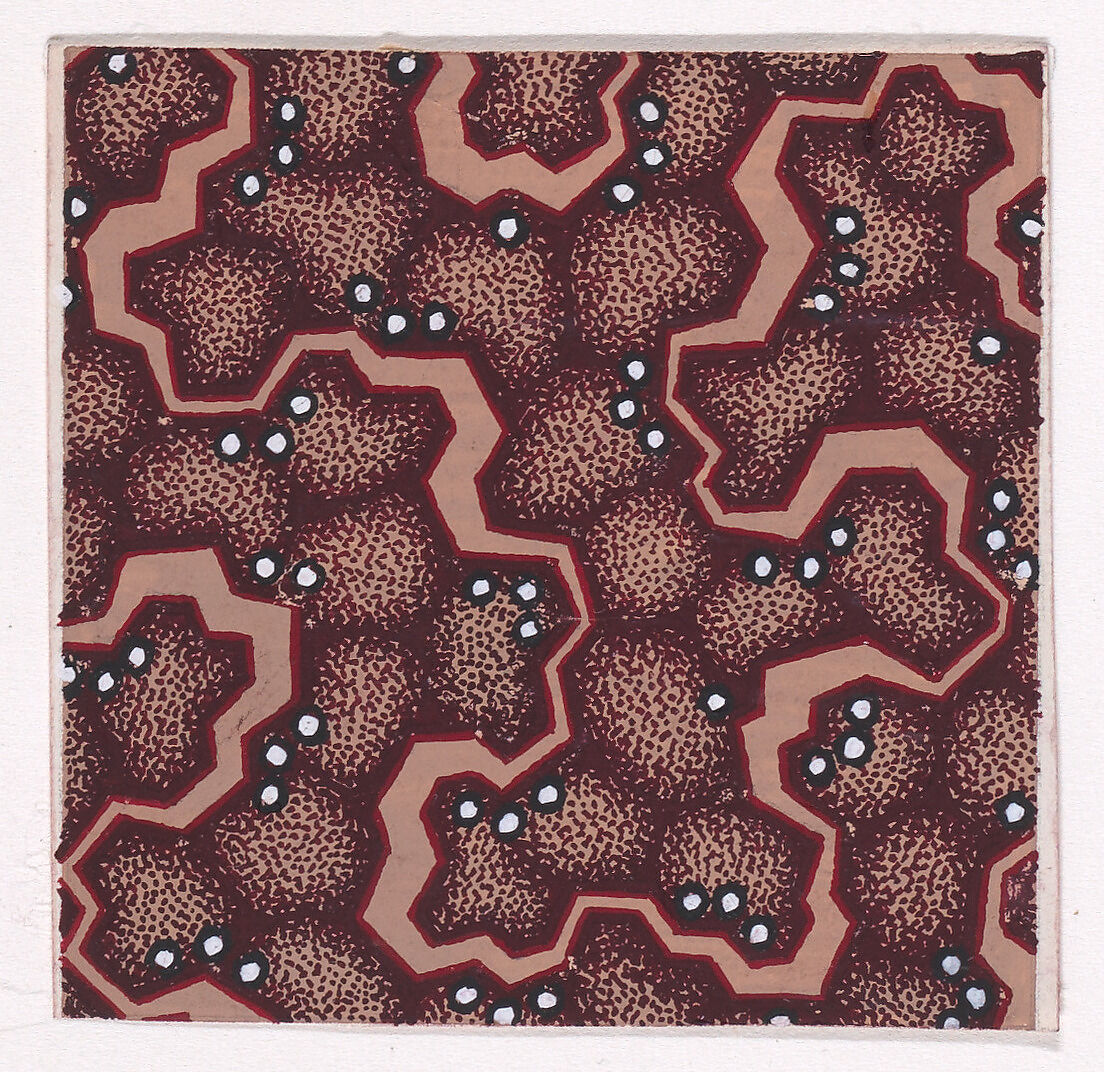 Rectangular sheet of paper with a textile design from a group, dated 1840, made in Mulhouse, Alsace, which was an important nineteenth-century center for textile production in the Haut-Rhin region of France. The design is made up of an abstract honeycomb pattern of dark reddish-brown color over a light tan base with stipples of dark reddish-brown color over which an undulating ribbon of hard edges decorated with groups of three pearls stands out. The ribbon is of light tan color, outlined with red lines, and the pearls are of white color.