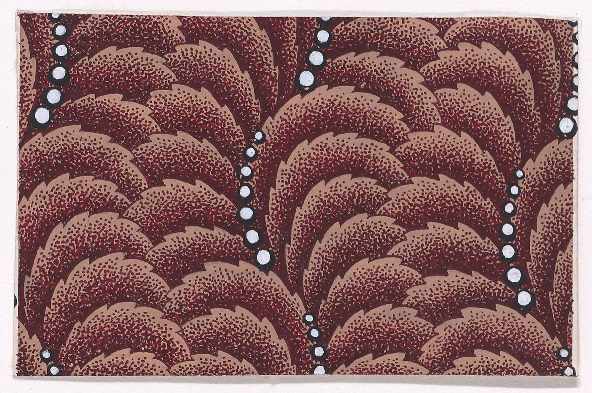 Rectangular sheet of paper with a textile design from a group, dated 1840, made in Mulhouse, Alsace, which was an important nineteenth-century center for textile production in the Haut-Rhin region of France. The design is made up of undulating vertical rows of overlapping scales of light tan color with stipples of dark reddish-brown color over which alternating curved strips of seven pearls of white color stand out.