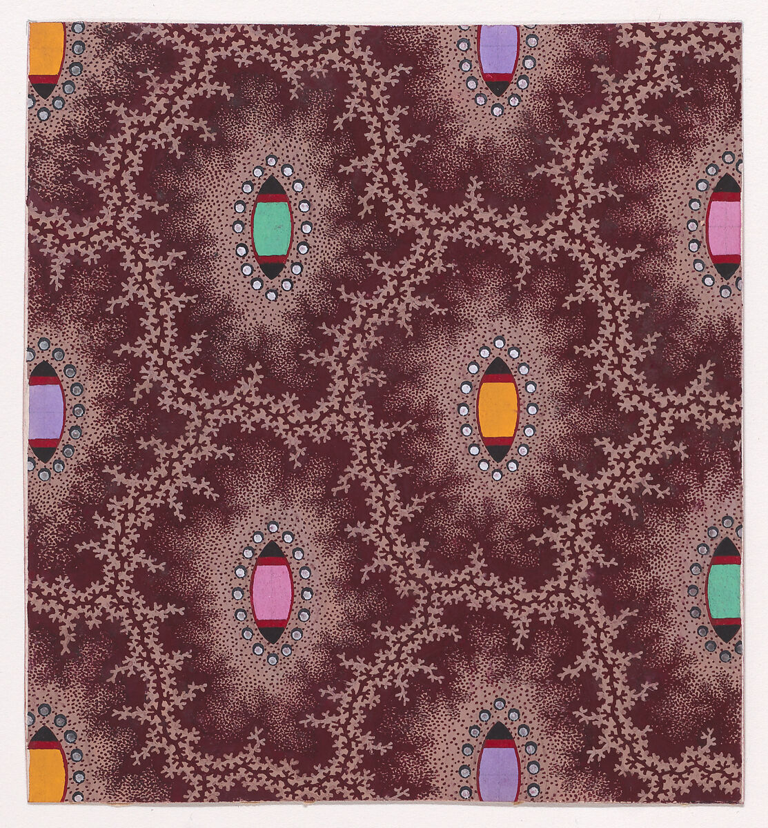 Rectangular sheet of paper with a textile design from a group, dated 1840, made in Mulhouse, Alsace, which was an important nineteenth-century center for textile production in the Haut-Rhin region of France. The design is made up of alternating vertical rows of shuttle shapes surrounded by 16 pearls, framed by interlacing garlands of branches of light tan color with offsetting branches rendered with stipples of dark reddish-brown color over a light tan ground with stipples of dark reddish-brown color. The shuttle shapes are colored alternatingly with green, yellow, and pink, and have one stripe of red color and one stripe of black color on each end. The pearls are colored with white.